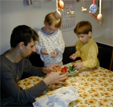 Barvení vajíček, snaha o co nejpestřejší byteček, do kterého se holčinky vrátí ze školky. Byly užaslé a nadšené, zdobily by každý centimetr našeho obydlí, malovaly by vajíčka jako na běžícím pásu (o ztrátovosti a rizikách podnikání nemusím nic podotýkat - umíte si představit Terku a její cit, který nemá pro bolest svou, ani pro křehkost dřevěných hraček, natož vejce). Stejně i tak to stálo za to. Večerní rozsvícené svíčky - vajíčka, chvilka povídání potmě jen osvětleni blikajícími knoty, to přesně potřebujeme. Všichni.