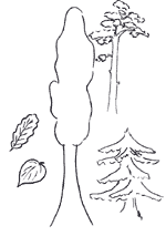 Na obrázku jsou tři stromy. Poznáte je? Který je topol? Dospěláci vám, děti, jistě rádi poradí. Říkejte si rozdíly mezi listnatými a jehličnatými stromy. Poznáte, kterým stromům patří namalované listy?