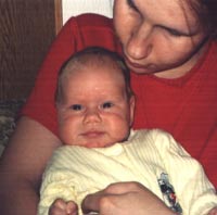 Když jsem přišla v deset na kliniku, už na mne Hebamme čekala, dala mi klystýr a vykoupala jsem se. Otevřená jsem byla na 6 cm. Všechno bylo v naprosté pohodě, žádné zmatkování a navíc jsme byli v porodním sále jenom tři. Žádná přebytečná sestra ani doktor, který by tenhle klid rušil. Porodní sál vypadal příjemně a útulně. Jako nějaký pokoj někde doma. Bylo tam také intimní světlo, žádné prudké, hrála hudba, ale jaká - tak to říct nemohu, protože to už mi praskla plodová voda a po pěti stazích byl klučina tady. Mého syna jsem mohla ještě hodinu chovat v náručí, než mi ho vzali k měření, vážení a kontrole, jestli je všechno v pořádku. Vychutnala jsem ten krásný pocit, že už jsem konečně matka, že ho můžu držet v náručí a mohla jsem si ho pořádně prohlédnout. Můj manžel přestřihl pupeční šňůru a brečel radostí. Nikdy jsem neviděla muže plakat a dojalo mě to. Byli jsme oba strašně moc šťastní a rádi, že to takhle všechno dopadlo. Klučina měl 50 cm a 2950g, teď po 16 týdnech má 68 cm a 7040 g. Radujeme se z každého pokroku, který ten malý udělá.