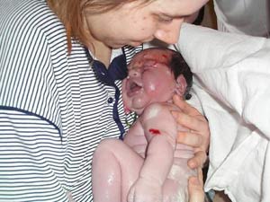 A taky jsem zrovna řešila dost zásadní problém - jak porodit. Nejradši bych rodila ve stoje, jenže jsem z toho zároveň měla obavy. Pokud nemám dost sebeovládání, abych v této poloze dokázala hejbnout zadkem, jak bych v ní tedy ze sebe mohla dostat mimčo? Asistentka zatím chystala prostor k porodu tak, aby byla připravená, až si vyberu. Přichystala i porodní stoličku s opěrkami - a to mi připadlo jako geniální nápad. Byla dostatečně pohodlná a navíc mi za zády stál manžel (ano, teď už jsem ho zase potřebovala :o) ), který mi dodával pocit jistoty. Možná to zní blbě, ale při tlačení jsem z něj vysávala sílu a mimo kontrakce jsem relaxovala na jeho hrudi :o) Netuším, jak dlouho jsem děťátko vytlačovala, snad patnáct-dvacet minut, docela dlouho. Teda, v porovnání s porodem Verunky - ta byla venku zcela bezbolestně (to se teď rozhodně říct nedalo) během pěti minut, na tři tlačící stahy (z toho během jednoho mě lékař vyšetřoval...). Přesto kdybych si i příště mohla vybrat mezi rychlým a bezbolestným porodem na lůžku a delším a bolestivým porodem v manželově náručí, bez váhání volím tu druhou možnost. Nějak dokážu rychleji zapomenout na bolest než na "chlad" porodního lůžka.