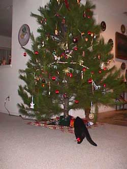 Dali jsme našemu stromečku vypít tenhle nápoj a už nám také stojí v pokoji. Nejdřív jsem trvala na českém zvyku strojit stromeček až na Štědrý den, ale už jsem podlehla Clarissčiným prosbám, že už ho všichni mají a proč my ne... Alespoň si ho víc užijeme. Hlavně ovšem naše kočička Lucinka, která se pod ním zabydela a která ho denně připraví o nějakou ozdobu...