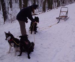 Neminka na nás už čekala i s paničkou. Nechali jsme psy chvilku vydovádět a konečně došlo na zapřahání, konečně bylo zapřaženo, konečně jsem si stoupla do saní a konečně jsme vyrazili. Přála bych vám aspoň na chvilku zažít ten úžasný pocit. Měla jsem dojem, že na celém světě existují jen mí tři psi, saně a já a cesta před námi. Měla jsem dojem, že tohle je zaručeně ten nejlepší způsob jak se zcela běžně pohybovat. Z mých hlubokomyslných úvah mě poněkud rušilo pouze lumpačení Nemi a Ramsese v přední linii. I psi propadli totiž podobné euforii a s vytlemeným výrazem se řítili lesem. Po takové dlouhé době bez ježdění člověk trošku vyjde ze cviku a hlavně jsem se musela smířit s faktem, že prakticky nemohu používat na namrzlé vrstvě brzdy.
