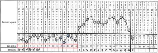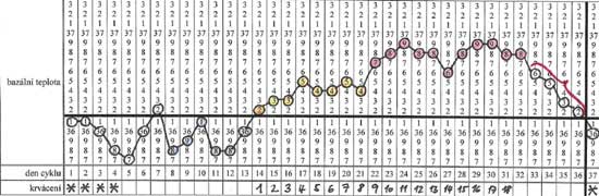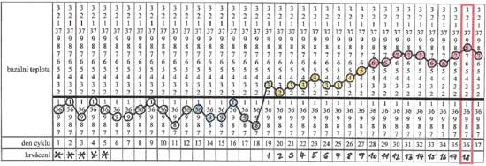 Abychom snázeji rozeznali folikulární fázi nižších teplot od luteální fáze vyšších teplot, vyznačíme si do grafu horizontální rozhraní těchto dvou fází. Je to čára o 0.05?C nad nejvyšší hodnotou posledních šesti dnů folikulární fáze: