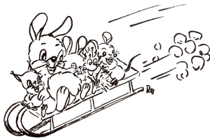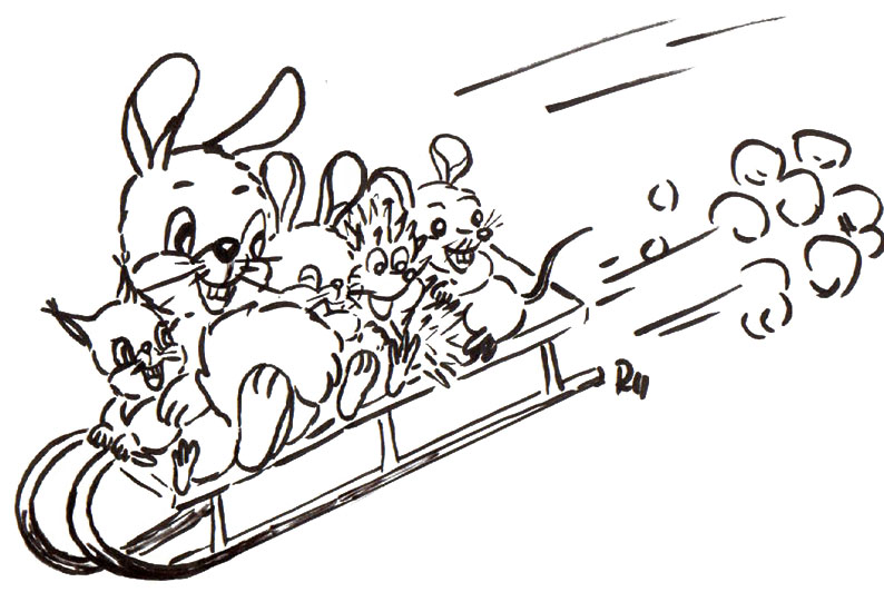 | Sáně z kopce rychle jedou, | (téměř) běžíme |