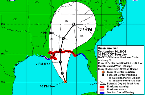 Hurikán Ivan ohrožuje letos hlavně perlu Hlubokého jihu - Big Easy - můj milovaný New Orleans. Jeho situace bývá často srovnávána s Benátkami. Leží mezi deltou Mississippi na břehu jezera Pontchartrain a i bez hurikánu potřebuje celý systém kanálů a mohutných pump, aby zůstávalo na suchu, protože jeho velká část leží 10 stop pod mořskou úrovní. Naposledy jej zasáhl hurikán Betsy (to se ještě dávala ženská jména, v roce 1965) a část města byla pod vodou 7 stop. Řada ústupových cest byla zaplavena. Starosta města už včera vyhlásil stav nebezpečí pro město.