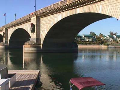 A teď si tam stojí, na břehu umělého jezera, které vzniklo jako výsledek přehrady pro eletrickou elektrárnu Parker Dam v roce 1938. Za celý rok v tomhle koutě Arizony spadne tak 12 centimetrů srážek (měsíční průměr v Evropě) a zimní teploty se pohybují mezi 5 stupni nad nulou a 28 stupni. To dělá jezero rybářským rájem i v zimě. Jezdí sem lidé i od nás z Kalifornie. Městečko jen s necelými 16.000 obyvateli má tři golfová hřiště, víc než 1.200 hotelových pokojů, výborné restaurace a nákupní střediska, rekreační zařízení pro vodní sporty a rybářský přístav, ale jinak není široko daleko nic... Jen spousta krásných kamenů. Můžete se ovšem prohánět na vodních lyžích pod pravým Londýnským mostem...
