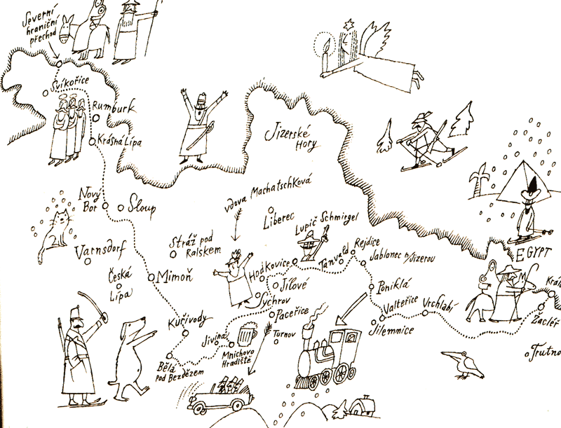 O pár kapitol dál uvádí ideální oběd, který připravila paní vdova Machatschková, kuchařka na zámku Sychrově, který patří do krajiny mého dětství, když promrzlému Hawlitschkovi předložila: "nejdřív hovězí polévku, potom vepřovou pečeni s českými knedlíky a jemně dušeným bílým zelím, k tomu meruňkový kompot, a jako moučník čerstvě upečené koláče, plněné zčásti mákem, zčásti povidly a k nim nalije…pěkně horkou kávu s cukrem a se smetanou k tomu…"