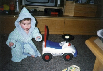 Martínkův stoj je už zcela jistý, a tak si ho zkouší ztížit. U stolu si stoupá na špičky a ručičkou šátrá, co by se dalo ze shora shodit, u pračky předkloní hlavu a strčí ji dovnitř, stoupne si u smetáku, u závěsu, zkrátka kdekoliv. Ale stoj už není to, co Martina baví. Chodit, to je lepší zábava. Od kamarádky máme půjčené odstrkovadlo - auto, které má vzadu vysoké madlo. Martin se neodstrkuje, ale auto tlačí a krásně chodí za ním. Ze začátku párkrát spadl, opřel se o madlo vší silou a auto se převážilo, ale nenechal se odradit.