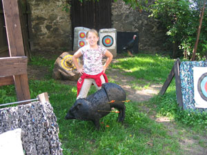 Na Kunětické Hoře mají pro děti, ale i dospělé, kterým nevyhasla romantická žíla, po celé léto, a snad i teď o sobotách a nedělích, možnost zahrát si na rytíře střílením z luků a kuší. Naše holky si to vyzkoušely a moc se jim to líbilo. Na hradním nádvoří mohou děti pobíhat kolik se jim chce. Jen při ceště na věž na ně musíte dát trochu pozor. V ohradě pod hradem jsou pštrosi, daňci, jeleni a nádherní koně. Můžete si zajezdit, (posouzení ceny nechám na vás) ale i koukání děti potěší. V restauraci tam mají průlezky a pískoviště, obsluha je příjemná, k dětem se chovají báječně, dá se tam pobýt i par dní v motýlku či kampovat. Takže je to vhodný výlet i pro ty, kdo to do Pardubic mají daleko.