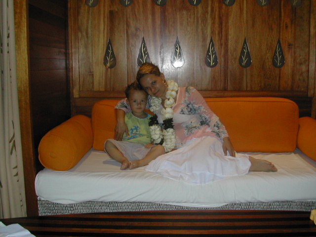 Zpět ale k našemu nočnímu příletu do hlavního města Papeete, kde na nás čekalo příjemných 22 stupňů :o), věnec úžasně vonících květin :o), kterým byl ověšen každý přijíždějící (a zdaleka nebyl na našem výletě poslední) a 6 hodin čekání na letecký spoj :o(, který nás měl přepravit na ostrov Bora Bora. Pokud jsem mluvila o stinných stránkách ráje, dalo by se říci, že tak dlouhé čekání na nočním letišti, kde nebylo nic jiného než malý bufet, je předpeklo ráje. Speciálně s dobře vyspaným synkem, který nutí střídavě nevyspalé rodiče k procházce po ztmavlém letišti a překypuje radostí z nových věcí, jakým je například kokrhání kohouta. Právě zde jsem si uvědomila velkou pravdu, že pro děti není cestování žádný problém. Je to naopak vítaná změna a vybočení z nudného stereotypu. Zdá se, že větší problém s cestováním s dětmi mají právě rodiče, kteří si problémy příliš připouští nebo si neumí v letadle odpočinout :o)