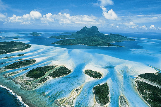 Ale abych pokračovala... Naprosto zdrchaní jsme v 8.20 nastoupili do prvního letadla, které na Bora Bora ten den mířilo a těšili se na konec cesty. Už při přistávání se nám rapidně zvedla nálada. Krása barev oceánu, který obepíná ostrůvek Bora Bora a jeho atol - se zkrátka nedá popsat. Snad vám tento pocit přiblíží alespoň jedna z fotografií, která ani tak nedokáže vystihnout nádheru lagun, které Vás při příletu vítají.