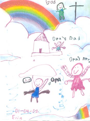 A že to rozhodně nebyl traumatický zážitek ani pro děti, ale zážitek pozitivní, je vidět na obrázku Erin, který namalovala pár dní po tom. Je možné, že to, že děti jsou věřící a smrt pro ně není KONEC jim pomáhá překonat tu ztrátu. Člověk odešel, ale jeho duše tu zůstává a jednou se sejdeme.