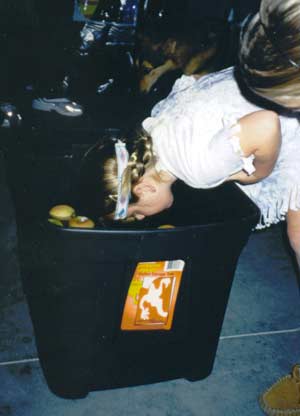 Velmi oblíbená hra je vyndávání jablíček, která plavou v sudu s vodou bez pomoci rukou. Tedy obličejem do vody.