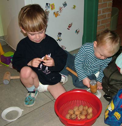 Od té doby je v naší kuchyni neustále přítomen košík s ořechy, dvě dřevěné paličky a dva gumové kroužky. Samotnou mě překvapilo, jak si kluci louskání oblíbili, louskají opravdu každý den. Zvládá ho jak tříletý Timík, tak rok a půl starý Filípek.