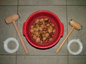 Zřejmě je něco prohnilého v louskáčcích belgického království, neb se mi už třetí zlomil. Co teď? I zkouším drtit ořech pantoflí. Ořech neposlouchá a tancuje po kuchyni. Zatímco ho lovím pod stolem, Timík se, po vzoru matky, snaží rozbít ořech svou papučkou č.23. Tudy cesta nevede, říkám si a pátrám po vhodnějším nástroji. Zajásám, když v šuplíku narazím na svatební sadu dřevěných paliček na maso. Vtípek, který se teď bude hodit. Paráda. Zamířím a podaří se mi ořech rozbít hned první ranou. Bohužel napadrť. Ale to vypilujem :-) Timík, opět po vzoru matky, ukořistil další paličku a honí ořech po kuchyni.