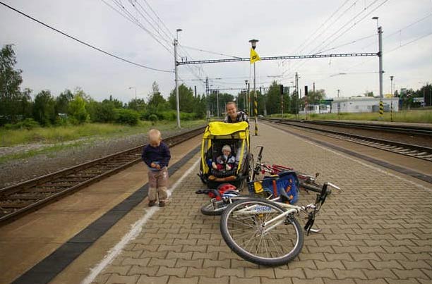 Je to tady, jsme trochu nervózní, jak to zvládneme - moje kolo se sedačkou pro Davida, manželovo kolo, vozík s autosedačkou pro Žabču, David a Žabča v mém náručí. Už ale není čas nad přemýšlením, vlak se přihnal, je čas nastoupit.