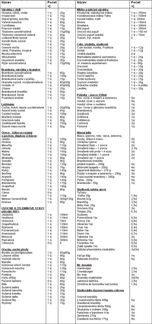 V seznamu jsou sacharidy přepočteny na tzv. výměnné jednotky - vj. 1vj = 10g sacharidů