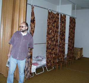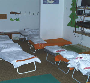 ![]() Další pohled do ložniček mrňousů. Pan Tůma, muž v popředí, ke škole sice nepatří, ale je také zajímavý: v roce 1994 se mu s manželkou podařilo oficiálně založit školu, která měla 4 žáky - jeho vlastní děti. Dnes už to ale tak snadné se zakládáním školy mít nebudete - každá nová škola musí mít alespoň 13 žáků. |