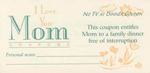 Ted jsem takovou kuponovou knizku pro maminky a babicky objevila v knihkupectvi. Prodavaji se i poukazky pro milence, pro tatinky, pro oblibeneho ucitele. Takova knizka obsahuje i 60 kuponu. Jsou vylepseny moudrymi nekdy i sentimentalnimi citaty na zadni strane. Ale ty ta vlastnorucne vytvorena nepotrebuje. Udelat ji opravdu neni tezke, ale aby mela smysl, je treba sve "sliby" take dodrzet.