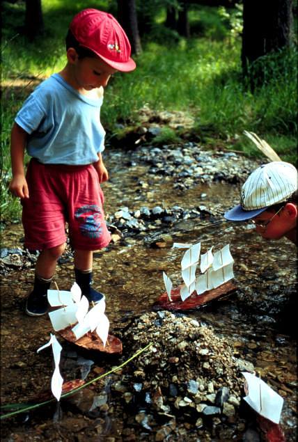 lese u potoka. Nožík, kůra a papír stačí ke klukovské zábavě.