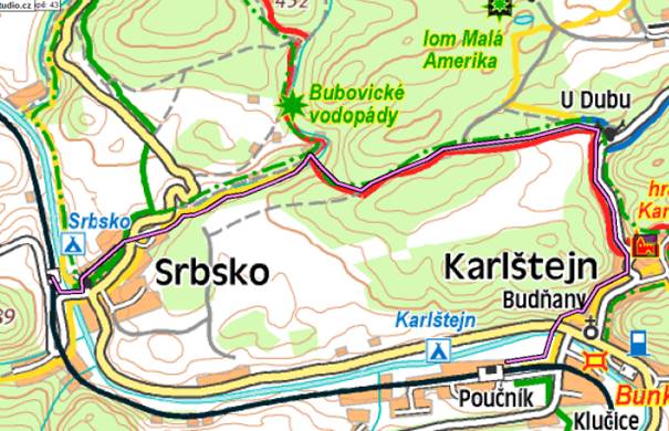 Na nádraží v Karlštejně vystoupíme vpravo po směru jízdy a vydáme se po ulici směrem k mostu přes Berounku. Vede zde žlutá turistická značka, ovšem i bez ní bychom hravě trefili, přešli most a zamířili středem stejnojmenné obce vzhůru ku hradu Karlštejnu. Projdeme obcí stále vzhůru a na náměstíčku nezapomeneme odbočit vlevo směrem k hostinci Pod Dračí skálou, tak, abychom měli hrad stále po naší pravé straně (tento úsek cesty je neznačený). Asfaltová ulice stoupá stále vzhůru, mineme zmíněný hostinec, až narazíme na červenou turistickou značku, na níž odbočíme z asfaltky vlevo na lesní cestu. Po chvíli dorazíme k rozcestí u statného dubiska, které nese název Dub sedmi bratří. Zde nám skýtá možnost odpočinku prostá lavička, na níž můžeme načerpat síly pro další šlapání, neboť, jak vzápětí s nevolí zjistíme, stoupání ani zde nekončí. Odsud pokračujeme stále po červené ve směru ke Kubrychtově boudě (popř. zde můžou být též jako cíl uvedeny Bubovické vodopády). Trasa vede stále po prašné cestě na rozhraní lesa a louky, po dosažení vrcholu (cca 1, 5 km) se vnoří do listnatého lesa. Stále se držíme červené turistické značky, která se stáčí vpravo a začíná intenzivně klesat, až vyjdeme z lesa na sympatickou louku, po které dorazíme až na rozcestí pod Kubrychtovou boudou. Chata zde opravdu stojí, avšak není komerčně využívána - kdo chce, může kolem ní dojít až ke spodní partii Bubovických vodopádů (v létě však povětšinou skoro bez vody) - po červené je to nepatrná zacházka. Kolem vodopádů pokračuje dále červená značka až do obce Svatý Jan pod Skalou, pro kočárek to ale ani trochu není. Vrátíme se zpět na rozcestí a pokračujeme pohodlnou prašnou cestou již po žluté turistické značce až do obce Srbsko, kde náš výlet končí. Cesta dolů vede zprvu po louce, poté příjemným lesíkem až k prvním vesnickým domům. Stále po žluté projdeme vsí, po mostě překonáme Berounku a ocitneme se u železniční trati Praha - Beroun. Zpět do Prahy jezdí vlaky po vzdálenější koleji, proto musíme trať podejít mírně strašidelným podchodem na protější nástupiště (jízdenky se však prodávají, pokud ještě vůbec, u koleje směr Beroun), kde nám zbývá již jen počkat na pantograf, který nás odveze nazpátek. Jedná se o stejnou trať, po které jsme přijeli, jen jsme se dostali o jednu zastávku dále - vlaky tedy jezdí často i ve směru zpátečním.