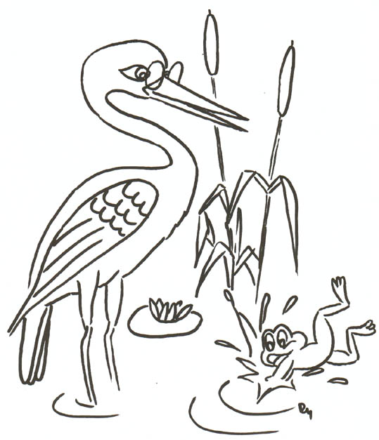 Omalovánku čápa a žáby najdete a vytisknete tady.