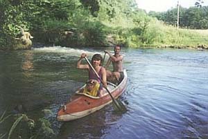 Ráno se probouzíme tradičně nejdříve my a tak vyrážím s Varikem na ranní procházku. Lékařka výpravy a plavčík zatím ještě spali, když jsme společně prozkoumali tunel z jedné i druhé strany a Varik se mezitím stačil podepsat na několik patníků u cesty. Po společné snídani nejprve přesouváme jedno auto do budoucího večerního tábora a zároveň využíváme v Mimoni možnosti nakupovat - je sobota dopoledne. Na vodu vyrážíme poměrně pozdě - asi kolem poledne. Pískovcový tunel (asi 100 m) projíždíme bez plavčíka, hlídala ho mezitím strážkyně deníku výpravy. Protože jsme většinu bagáže nechali v autech máme v bandě jen to nejnutnější - náhradní oblečení, jídlo, foťák, repelent, krém na opalování, vařič a ešák. Plavčíkovi jsme upravili ležení před háčkem. Zabalili jsme spacák do igelitového pytle a převázali provazem. Tento polštář jsme položili před háčka (maminu) na podlážku a zasunuli částečně do špičky lodě. Stupeň zasunutí a vysunutí závisel na Martínkovo náladě a poloze (ve stoje, vsedě, vleže). Rovněž pomoc háčka při pádlování byla závislá na Martínkovi. Vzhledem k pozdějšímu zahájení plavby Martínek brzy usnul, a tak jsme asi 2 hodiny pádlovali společně (kormidelník i háček). Varik seděl či stál nohama opřen o bandu před kormidelníkem a se zdviženou hlavou pozoroval dění kolem. Když mu bylo moc teplo (sluníčko pražilo již od rána), tak se skočil osvěžit do řeky. Asi 1,5 hod po plavčíkově probuzení zastavujeme u břehu a děláme 45minutovou přestávku na oběd. Martínek baští ohřátou bramboračku s chutí a Varik mezitím lítá někde po lese. Po nalodění chce plavčík taky pádlovat, a proto pomáhá mamině vepředu - jednou rukou drží pádlo. Zřejmě se mu jízda na lodi líbí, neboť si hraje na auto a naše pobízení "jedeme , jedemééé" doprovází svým tradičním "Brrrrrrr, brrrrr". Notně unaveni se rozhodneme zakotvit na krásné louce a od ostatních vodáku zjišťujeme, že jsme asi 15 min chůze od auta zaparkovaném v obci Hradčany. Zatímco ostatní odpočívají, nablížují navigátor a sekretář obě auta. Později stavíme stany, rozděláváme oheň, pečeme buřty a probíráme dnešní etapu. Před večeří ještě vyrážíme na písčitou pláž - vykoupat se v rybníku v Hradčanech. Nádherné místo, můžeme vřele doporučit.