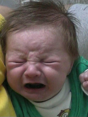 Horší bylo, když se z něho stal stále hladový Adam. Začalo to někdy začátkem minulého týdne (to mu bylo 2 a půl týdne) a prožili jsme docela krušné chvilky. Prostě chtěl pořád jen jíst a jíst. Ručičku dával do pusinky, div že si ji nespolkl, když jsem ho vzala (nebo i Skoky) na ruku, tak hledal prs. A ještě to bylo doprovázeno velkým pláčem, no spíš řevem, na který nezabíralo absolutně nic. Zajímavé je, že takový velký hlad měl hlavně večer, přes den to relativně šlo. Když řve hlady, vypadá takhle, a to ještě není ta nejhorší fáze řvaní: