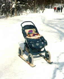 V zimě se nám použití lyžnic/sanic velmi osvědčilo. Na sněhu není potřeba tlačit takovou silou, dají se dobře přejíždět díry a hrboly a když je potřeba jet kousek po nezasněžené cestě je možno je rychle odmontovat a uložit do košíku kočárku. V měkkém hlubokém sněhu se kočárek propadá (závisí na váze dítěte a kočárku), a tak je třeba vybírat zamrzlejší povrchy. Kočárek je také šikovnější než samotné sáně - lepší tepelná izolace a možnost použití pláštěnky v chumelenici či silném větru.