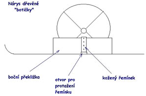 V další fázi si připravíme 8 klínků (jeden před a jeden za každé kolečko) nejlépe o asi 0,5 cm širších než je rozměr pneumatiky. Pro správnou délku překližky, která se přikládá z obou boků kolečka, je potřeba při měření podložit kolečko koženým řemínkem, který by jinak změlčil dřevěnou kapsu při připínání kolečka a klíny už by také ideálně neseděly. Nařežeme dle ověřených rozměrů potřebné kousky překližek (také 8 kusů). Uprostřed každého dílu vyřežeme na spodní hraně otvor pro protáhnutí řemínku a slepíme a sešroubujeme společně s klínky tak, aby vznikly 4 dřevěné "botičky" (viz nákres).