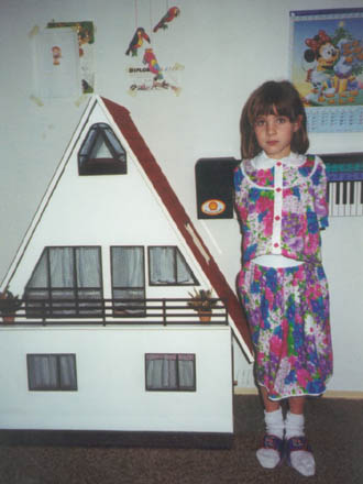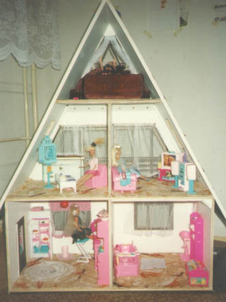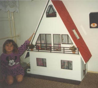 Tak tenhle domeček jsem vymyslela už dávno, ale k jeho realizaci se náš taťka odhodlal zhruba před 4 lety, když bylo naší Míše sedm. Nakreslila jsem mu, jak bych si ho asi představovala, a on ho podle mého nákresu a podle vlastních originálních nápadů usochal.