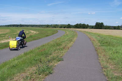 Stezka vede dlouhé kilometry po povodňové hrázi, za řekou je Polsko a krajina je, jako všude v pohraničí, panenská, opuštěná. Lesy a louky poskytují dostatek míst k volnému táboření. Jedeme krajem, kde se psala historie, za války posunovaly hranice a pálily mosty. Jejich torza do dnešního dne stojí na obou březích řeky Nisy. Hranice rozdělila města na dvě části - jedna půlka tak leží v Polsku, druhá v Německu. Přišli jsme na výborný fígl - polská část města je skoro vždycky spojena s tou německou mostem - přejíždíme tak na nákupy do polských supermarketů, kde je o poznání levněji než v těch německých. Němci to také moc dobře vědí.