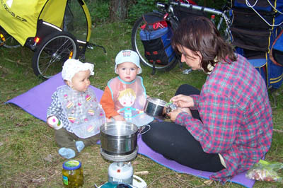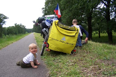 Rychle si zvykly, ono jim taky nic jiného nezbývalo. Chudáci, pomyslíte si, ale já to vidím jinak. Když dneska vytáhneme ze stodoly už značně ojetý žlutý vozík, nadšeně se do něho budou vrhat a zapínat si pásy. Kdyby na cestování s námi měly špatné vzpomínky, daly by to jistě najevo. Možná namítnete, že máme štěstí, že vaše děti by nevydržely sedět ve vozíku déle než půl hodiny. A zkoušeli jste to? Pravdou je, že naše děti nepřekypují tím zběsilým temperamentem a energií, jako někteří jejich vrstevníci, takže možná že o tohle to máme jednodušší. Samozřejmě, že se snažíme cestování dětem přizpůsobit. Často zastavujeme, aby se mohly protáhnout a proběhnout, motivujeme k další jízdě tím, že jedeme například na zmrzlinu, ale úspěch má i "na hrad", "na rozhlednu" a podobně. Nějak extra se nesnažíme dětem na cestách nahradit domov, naopak chceme, aby je bavilo cestování takové, jaké je. V praxi to znamená třeba to, že nevláčíme zbytečně skoro žádné hračky, jako zábava jim musí posloužit to, co přinese cesta. A skutečně to funguje. Jako hračky jim poslouží třeba lžíce a kastrůlek. Pozná dítě, že to nejsou hračky ve svém pravém slova smyslu? Často potkají na dětském hřišti či pískovišti nějakého nového kamaráda, uvidí zajímavé zvíře, nebo velká atrakce je pro ně třeba jenom hospůdka či obchůdek. Snažíme se, aby si všímaly věcí kolem sebe. Všechno je kolem nich nové, neokoukané, nevšední a právě to způsobuje jejich nadšení z takového cestování. Zapojujeme je do všech aktivit: chodí s námi nakupovat, pomáhají stavět stan, nutíme je, aby se nebály a komunikovaly s cizími lidmi. Každého si Víťa získal svým pozdravem naučeným německy nebo polsky. Víťa má ve vozíku na starost pomáhat malé Šárce, podávat jí pití a být na ní hodný. Když zlobil, a třeba i Šárku plácnul, tak se osvědčila následující metoda: zastavit, vysadit a odjet (samozřejmě jen pár desítek metrů a jen na bezpečném místě bez aut). Zoufalost v očích dvouletého dítěte - uvědomil si dobře, co by to pro něj znamenalo. K tomuto razantnímu kroku jsme se museli uchýlit jen dvakrát za celou cestu, většinou stačilo jen pohrozit: "nezlob Šárku nebo si vystoupíš". Ale po naprostou většinu času byly zlaté, ba úplně miliónové. Už se těšíme, co dalšího všichni společně podnikneme.