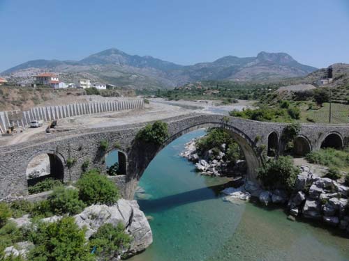 Černou Horu opouštíme po pouhých 131 kilometrech přejezdem do Albánie. Hned za hranicí se silnice změnila z asfaltové na prašnou a objevily se mercedesy. Po cestě s výhledem na Skadarské jezero přijíždíme do Shkodëru. Město je typicky Albánské. Hned na předměstí uhýbáme doleva a vydáváme se pár kilometrů po cestě, po které se běžně jezdí do národního parku Theth. Tam si s vozíčkem opravdu netroufáme, a i když nepochybujeme, že bychom to zvládli, náš cíl je prozatím vesnička Ura e Mesit. Řeku zde překlenuje více než sto metrů dlouhý kamenný most s třinácti oblouky. Vypadá famózně, řeka je azurově modrá a pozadí se strmými štíty Albánských Alp celý obrázek dokonale dokresluje.