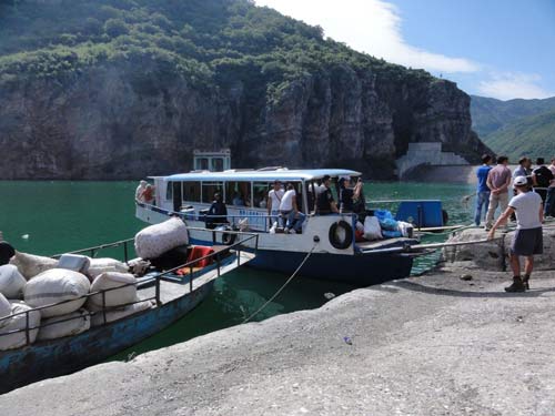 Jezero Komani patří k soustavě přehrad na řece Drině, která vznikla v 70 letech minulého století a stala se významným dodavatelem elektřiny pro severní Albánii. Vodní nádrž však zatopila cestu a údolím není možné projet dále - jedině po vodě. Trajekt do Fierze odplouvá každé ráno v 10 hodin a plavba patří k albánským turistickým atrakcím. Nespěcháme s balením a klidně snídáme. Najednou se tu objevil malý klučina a anglicky nám povídá, že bychom si měli pospíšit, že loď už je nachystaná k odplutí. Asi věděl, že do přístavu trajektu (albánky se trajekt řekne "traged") jsou to ještě dva kilometry, z nichž polovina je do prudkého kopce. Stresujeme hned po ránu - jestli nám to ujede, co tady budeme do zítřka dělat?