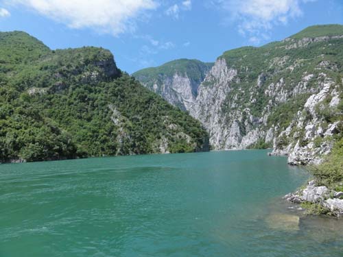 Všechna sedadla jsou už skoro obsazená (většinou mladými muži oblečenými do bílých triček a moderních džínsů) a ti teď pozorují, jak se marně snažíme naše kola a vozíky naložit po úzkém můstku na plavidlo. Jsem už docela naštvaná, česky na ně řvu, jestli by mi mohli pomoci. Docvaklo jim to poměrně rychle a zanedlouho jsou naše kola opřená o bok autobusu. Ještě natankovat naftu z dodávky a odplouváme. Plavba je opravdu zážitek - pohledy na rozeklané skály a modrozelenou hladinu vody jsou opravdu úchvatné. Mezi cestujícími je několik turistů, z toho dva naši krajané, většinou jde ale o místní, pro něž je plavba zážitek asi tak jako pro Pražáka cesta metrem z Jižního města do práce. Naše dětičky si oblíbila mladá albánská holka a skoro celou cestu si s nimi hraje a neustále je "pusinkuje". Občas loďka přirazí ke skalnatému srázu, kde někdo nový naskočí nebo naopak vyskočí na břeh. Úzká pěšina se vine kamsi vysoko, náklad naložit na osla a pěšky nahoru - žádné obydlí ale nevidíme. Jak tady někdo může žít? A co třeba děti, jak a kam chodí do školy? Albánské rodiny mívají velký počet dětí…