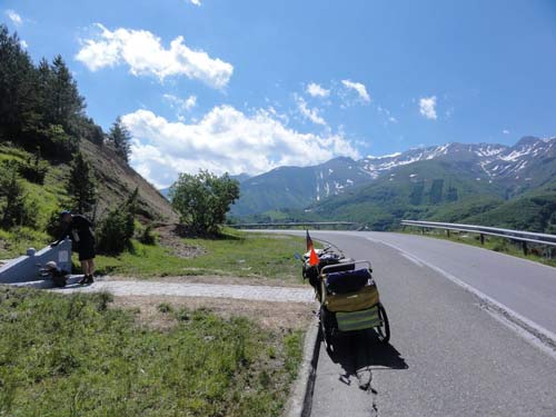 S přibývající nadmořskou výškou se postupně ochlazuje, nebo je to tím, že se blíží večer? Stoupání je nekonečné. Konečně se zdají ale útrapy u konce - objevily se sjezdovky, horské hotely a apartmány. Takový ten cirkus evropského standardu. Kolem půl osmé večer GPS ukazuje nadmořskou výšku 1805 metrů - nejvyšší bod celé cesty. Pocit je to slavnostní, ale vůbec se nám tu nelíbí. Okolí kazí ohyzdné stavby obřích hotelových komplexů, které jsou postaveny v takovém rádoby romantickém stylu - všude balkonky, věžičky a různé stříšky. Raději jedeme hledat nocleh. Dnes jsme díky náročnému stoupání najeli jen 44 kilometrů, ale uklidňuje nás to, že šlo o poslední velký kopec, který jsme museli zdolat a samozřejmě se těšíme na sjezd. Nocujeme u nějaké horské chatky s krásným výhledem asi v 1600 m n. m. Další den sjíždíme pod hory Kopaoniku, silnice se vlní mezi překrásnými kopečky nahoru a dolů - louky svěže voní čerstvě pokoseným senem a všude kvete spousta květin. Je tu nádherně!