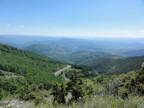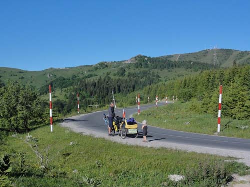 Těsně za hranicí však končí pohoda podél řeky. Ten kdo trasu plánoval (my), nám v těchto místech naplánoval přejezd pohoří Kopaonik. Vyšplhat se musíme až do 1.800 metrů nad mořem, čili máme před sebou převýšení skoro 1.300 metrů. Silnice začala bez varování stoupat hned pěkně zostra. Díky 8 - 10 % stoupání máme za chvíli jako na dlani celou cestu, kterou jsme od rána absolvovali. Notně zoomujeme, abychom vyfotili rozlehlou základnu srbských vojáků nedaleko hraničního přechodu. Slunce začíná nepěkně připalovat a stoupání je čím dál náročnější. 10-12% kopec už nedám, dlouhé úseky slézám a kolo tlačím. Nikde ani troška stínu, chabé osvěžení poskytují lány lesních jahod podél silnice. První pivo je až v 900 nadmořských metrech, v Šipačině. Děti mají samozřejmě rády jakékoliv rozptýlení a vítají odpočinek s posezením u obchůdku. A zase vědí (a trochu se naučily s tím počítat), že nepřijdou zkrátka a od místních něco dobrého dostanou. A ani tady nebyla výjimka. Když chceme platit, majitel jen mávl rukou. Platit? Ništo! Ovde je Serbia. Nechávám Luďka a děti ještě chvíli odpočívat a vydávám se napřed - ještě nejsme ani v půlce. Okolní zelené kopce si vůbec nedokážu vychutnat, tenhle kopec se zdá, že bude nad moje síly.
