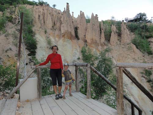 Neházíme, ani nebereme. Pokračujeme dál. Les se pomalu rozestupuje a my se ocitáme ve zvláštní rokli - všude kolem nás se tyčí oranžové pilíře, některé mají na špičce černý kámen. Podobné pajduláky jsme viděli vloni v makedonské Kuklici, též můžou připomínat bulharské Melnické pyramidy. Zde jsou ale zase trochu jiné. Po dřevěných schůdkách je možné obejít celou rokli a nakouknout i do sousední, kde je podobných útvarů méně. Nakonec nocujeme na verandě jedné z chatek nedaleko parkoviště. Po 92 kilometrech a po prohlídce Ďáblových měst se nám už nikam odjíždět nechce.
