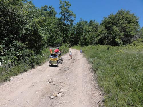 Za chvíli sedíme u kafe se Zoranem a jeho ženou, jejich 3 děti spí po obědě vevnitř v domě. No, v domě - to je hodně silné slovo - chaloupka hlínou oplácaná jako kdybychom se vrátili o 100 let zpátky. V horách tu žijí ještě se svými příbuznými (ti mají "kůču" někde vedle) a život tu rozhodně není jednoduchý. Možná právě proto Zoran chápe, co je teď potřeba. Aniž bychom řekli slovo s prosbou o pomoc (zeptali jsme se pouze, kudy dál), nakládá naše kola a vozík s dětmi na vlečku, tu zapojuje za traktůrek a vydává se s námi na sedm kilometrů dlouho cestu lesem po cestách-necestách, kde bychom stoprocentně zabloudili hned na prvním rozcestí. Peníze žádné nechce, přesto jsme vnutili 1000 dinárů (asi dvě stovky) jeho manželce a další peníze necháváme na sedadle traktůrku, když nás na druhé straně kopců vysadil. Vyhráno ale zatím nemáme, na asfalt je to ještě 5 kilometrů po pěkně hnusné lesní cestě, ale chválabohu, nejsou už žádná rozcestí. Jak jen jsme mohli takhle zabloudit? Neříkala jsem po přejezdu Kopaoniku, že ty nejhorší kopce máme už za sebou? Prdlajs!