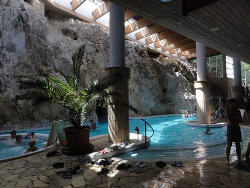 Po cyklostezce se noříme mezi hory a poté ještě během odpoledne jako nic zdoláváme obávané stoupání. V podstatě jsme celé hory přejeli během chvilky, další den už jenom sjíždíme na druhé straně směrem do Miskolce. Ten si ale necháváme na později. Deset kilometrů od centra města leží totiž vyhlášené termální lázně Miskolctapolca. Jde o skutečnou raritu - lázně jsou vybudovány ve skále v opravdových jeskyních. Po chvíli dohadování si smíme i tady vzít kola s sebou do areálu a potom nás čeká skutečná bomba. Vstupné je sice o něco vyšší než jinde, ale můžeme si zakoupit vstupenku na 4 hodiny (zatímco jinde to bylo vždy na celý den) a navíc lze platit kartou. Peněz ale nelitujeme a ty čtyři hodiny nám nakonec uběhly jako nic. V pravé poledne jsme rádi za jeskyní koupele - podzemní prostory jsou pospojované kanály, můstky a chodbičkami, každá jeskyně má svou výzdobu, je tu i umělý vodopád a další. Prostě nádhera! Po koupání jsme jak praštění palicí, hodiny v teplé vodě udělají své. Děti byly v bazénech plné energie a teď si oba rádi sedli do vozíku a odpočívají.