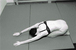 Leh ze sedu: dolní končetiny pokrčené, paty se opírají o podložku, horní končetiny v předpažení, sepnuté k sobě, lopatky co nejvíce stažené dolů k páteři. Hlava v protažení. Nádech nosem na 4 doby, při výdechu na 6 dob hlavu přitahujeme k hrudníku se současným pokládáním trupu směrem k podložce.