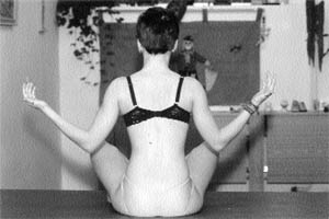 Turecký sed, hlava v prodloužení páteře, brada svírá s trupem pravý úhel, horní končetiny ve svícnu, dlaně směřují k hlavě, palce vzad. Nádech nosem na 4 doby, při výdechu na 6 dob stahujeme lokty k tělu. Nádech nosem na 4 doby, při výdechu na 6 dob vracíme lokty zpět do výchozího postavení.