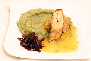 Zvítězilo konfitované kuřecí prso á la bažant obalené v anglické slanině s kapustovým pure a glazírovanou červenou cibulkou.
