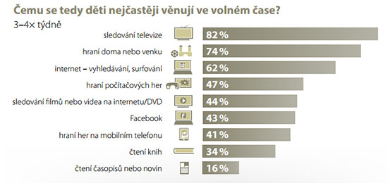 Nejvíce volného času děti stále tráví sledováním televize (denně cca 1,5 hod.). Téměř čtvrtina dětí hraje denně elektronické hry (55 minut), chlapci téměř třikrát častěji než dívky. Z hlediska věku kulminuje hraní elektronických her ve věkové kategorii 11-12 let (denně 29 % dětí). Téměř dvě pětiny dětí denně surfují na internetu (55 minut) a více než čtvrtina dětí je denně na Facebooku (38 minut). Frekvence četby knih s rostoucím věkem mírně klesá, děti čtou sice méně často, ale déle (42 minut). Knihy již nějakou dobu ztrácejí roli zdroje informací, děti častěji využívají pro školní práce internet. Vztah dětí k elektronickým knihám je zatím nejednoznačný, většinou s nimi nemají zkušenost. Školní knihovny jsou málo využívány, veřejné knihovny navštěvuje zhruba polovina dětí.