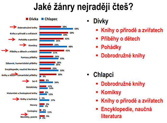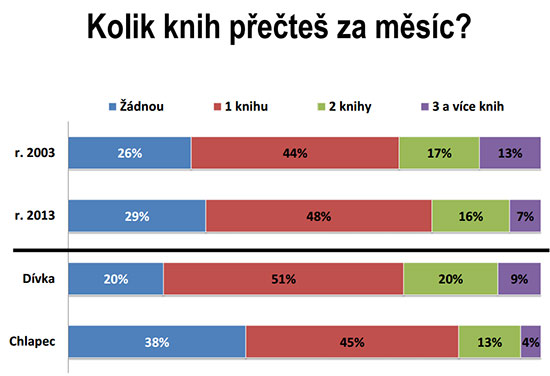 Čtení knih patří k zábavným činnostem volného času pro 47 % českých dětí, ale pro mnohé z nich je také spojeno s nudou (18 %). Existují výrazné genderové rozdíly - 59% dívek považuje čtení za zábavné, u chlapců je to však pouze 37%. S rostoucím věkem vnímají děti význam četby knih pro vzdělávání (35 %). Třetina dětí čte knihy každý den, ale další třetina nepřečte za měsíc ani jednu knihu. Hlavním důvodem pro nečtenářství je konstatování, že čtení "nebaví," silnou konkurencí jsou jiné aktivity - film, televize, internet, Facebook a počítačové hry.
