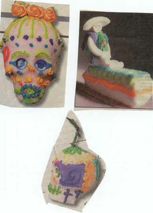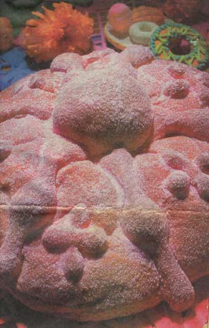 ![]() PAN DE MUERTOS. Specialni chleba, ktery se pece v Mexiku na Dusicky. Velka kouhle symbolizuje hlavu rodiny, skrizene "nohy" ty, kdo zemreli. Kvetiny a cukrove figurky jsou take symbolem svatku.  |