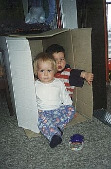 Nedávno jsem potřebovala být dopoledne v práci a tak Martínek byl u Hynka. Káťa si je moc pochvalovala, celé dopoledne si hráli skoro samostatně - jen když nosili kameny, Káťa hlídala. Nejvíc je ale nakonec bavily peřiny. Nanosili si je do kuchyně a 3/4 hodiny se v nich různě váleli, přikrývali, hopsali a převalovali. Kluci si tak rozumějí, že když ráno Martinovi řeknu: " Jsi můj kluk'', odpoví: "Ne'', a když se zeptám: "Jdeme za Hynkem?'', řekne: "Hmm'' (= jo jdeme). V létě jsme se společně jezdili koupat k rybníku s písčitou plážičkou. To byl pro kluky zážitek. Mohli bez jakéhokoliv mámina napomínání ve vodě cákat, stříkat, dupat, běhali po břehu, koupali se sami až po ramena a plavali společně s námi. Teď, když je spousta louží, chtějí obdobné hrátky provozovat v nich. Hynek jak vidí louži, okamžitě se do ní vrhá a dupe. Nejde ho odchytit, je zkrátka rychlejší. Už kolikrát jsme se jeli domů převléknout. Oba kluci milují veškeré prolézačky, kolotoč, houpačky a písek. Kyblíček, lopatka a hrabičky jsou na ranní procházky nezbytností. Když náhodou místo na písek jdeme do lesa, houpou se kluci na závoře.