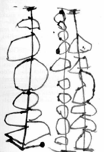 Rostliny – stromy (3; 4). Základní podoba stromu je vytvořena rovnou čárou a oválem (podobně jako první podoba člověka, sluníčka). Jako symbol je kresba dostatečně zřetelná – rozlišení mezí listím, jehličím, větvovím a okvětím není provedeno.