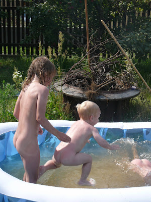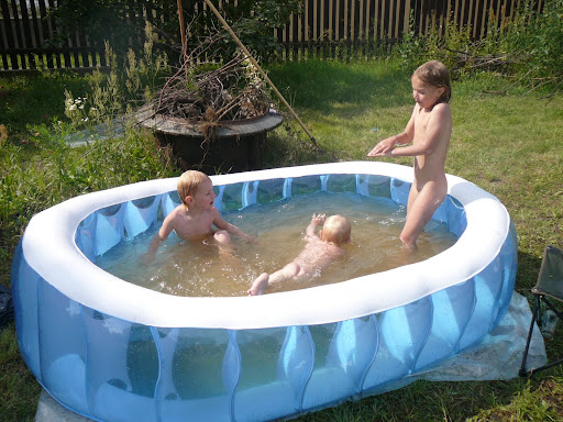 K bazénku-nedávám ani rukávky, ani kruh.... Prostě dítka řádí-jen je pořád někdo šmíruje ![]() Voda byla ráno napuštěná čistá,ale jak vždycky vylezli, rozběhli se a skočili, tak si tam natahali za chvilku blátíčko a trávu. To se netopí, to plave ![]() |